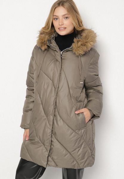 Ciemnozielona Kurtka z Asymetrycznym Pikowaniem i Kapturem z Futerkiem Ruvita
