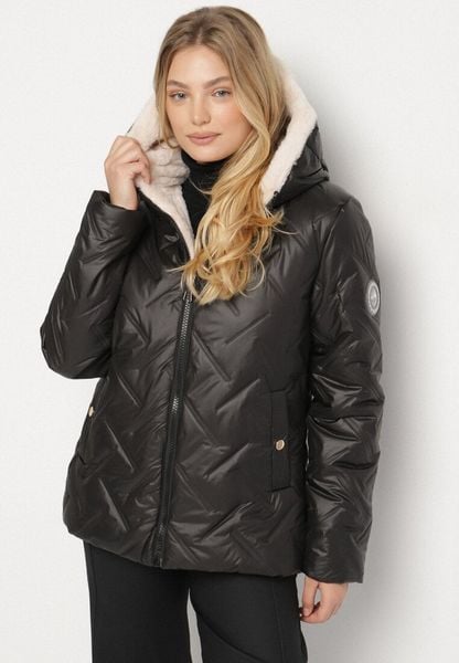 Czarno-Beżowa Pikowana Kurtka o Prostym Kroju z Kapturem Avilerie