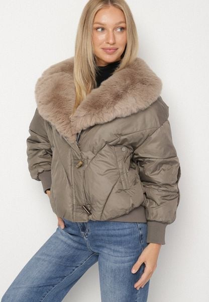 Ciemnozielona Pikowana Kurtka o Pudełkowym Kroju z Kapturem z Futerkiem Rivitta