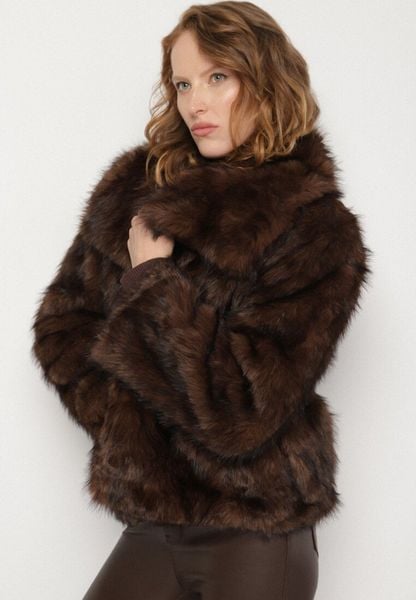 Brązowa Kurtka Futerko z Jednorzędowym Zapięciem i Szerokim Kołnierzem Tesella