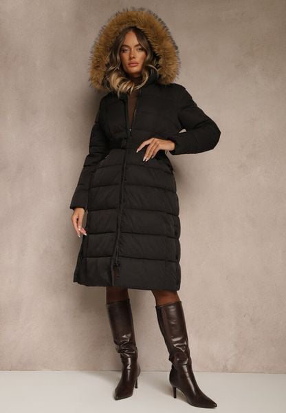 Czarna Kurtka z Pikowanym Przeszyciami Wiązanym Paskiem i Kapturem z Futrem Fenida