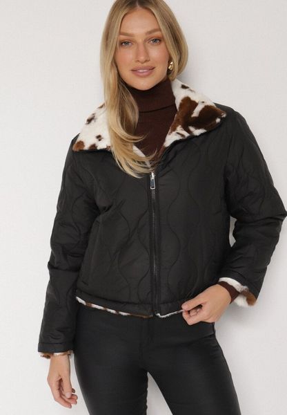 Czarna Dwustronna Pikowana Kurtka z Futerkiem w Łaty Meviatella