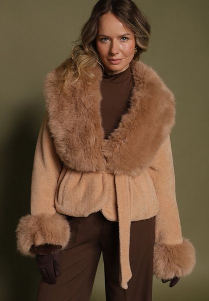 Brązowa Pluszowa Kurtka z Futrzanym Kołnierzem i Mankietami Wiązana w Pasie Arevitte