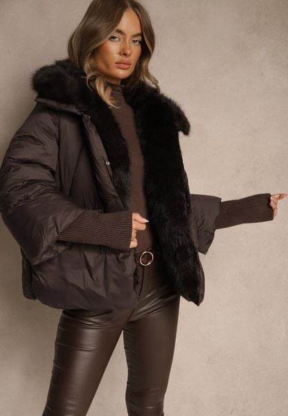 Brązowa Kurtka Pikowana z Kapturem Futerkiem i Ściągaczami przy Rękawach Ravindelle