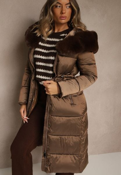 Brązowa Puchowa Kurtka Pikowana o Długim Kroju z Kapturem z Futerkiem Bavea