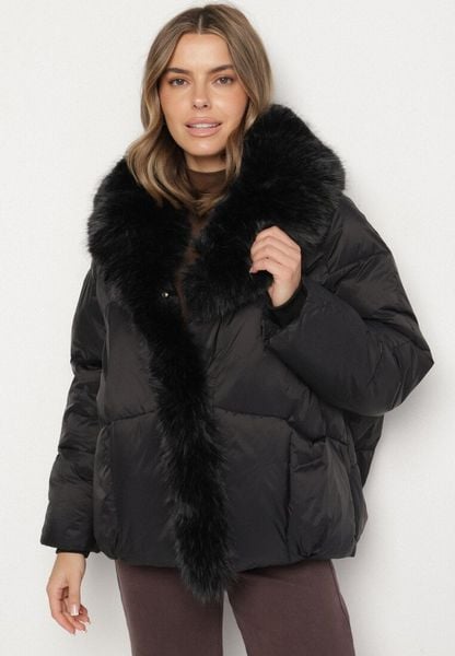 Czarna Zimowa Kurtka Pikowana z Futrzanym Kołnierzem i Wysokimi Ściągaczami Tilastra
