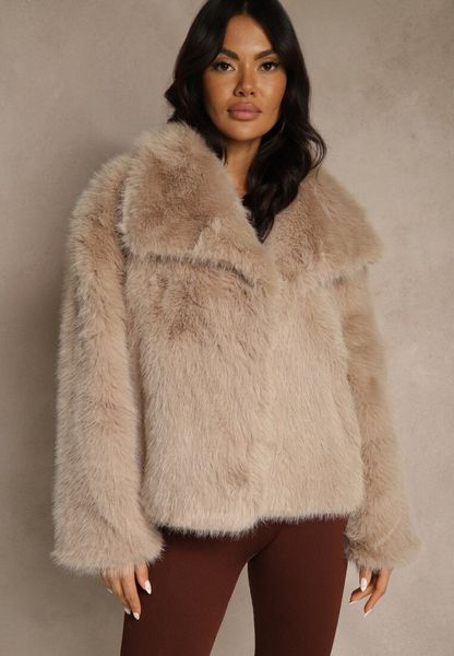 Beżowa Kurtka Futerko o Jednorzędowym Kroju z Szerokim Kołnierzem Dezile