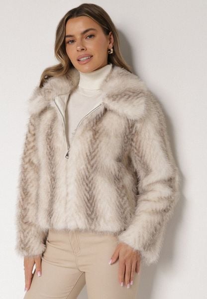 Jasnobeżowa Kurtka Futerko o Prostym Kroju z Zapięciem na Suwak Tusiviela