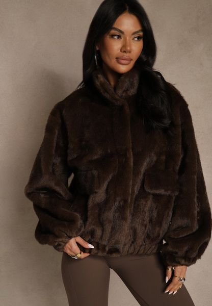 Brązowa Futrzana Kurtka Bomberka z Kieszeniami Tiwedela