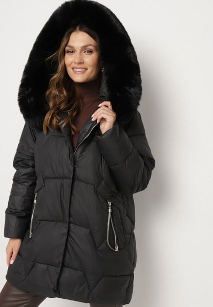 Czarna Pikowana Kurtka o Prostym Kroju z Kapturem i Odpinanym Futerkiem Inavirae