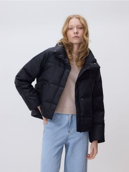 Kurtka o swobodnym kroju, wykonana z pikowanej tkaniny z wypełnieniem puchowym.