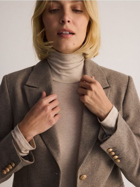 Marynarka o prostym kroju, wykonana z tkaniny z wełną.