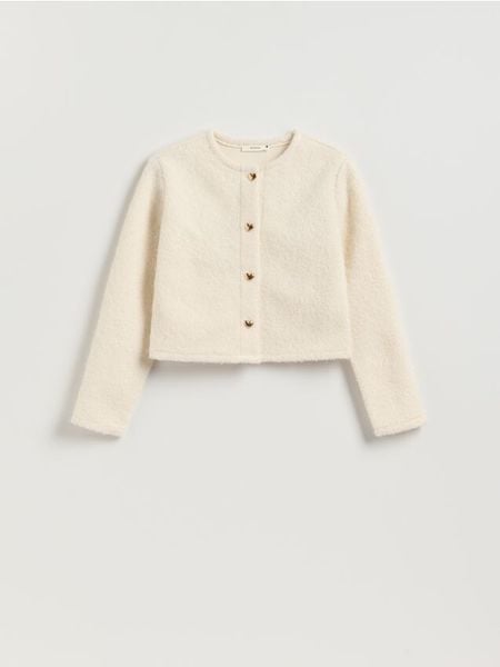 Żakiet o prostym fasonie, wykonany z gładkiej dzianiny.