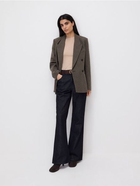 Marynarka o prostym kroju, wykonana z tkaniny z wełną.
