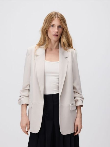 Beżowa Marynarka z Ozdobnymi Klapami i Marszczonymi Rękawami Elsituni