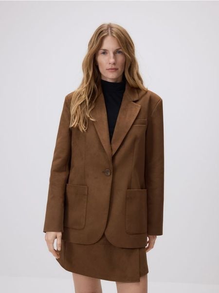 Marynarka o prostym kroju, wykonana z imitacji zamszu.