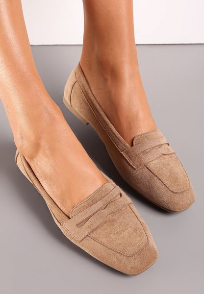 Ciemnobeżowe Mokasyny z Kwadratowym Noskiem z Imitacji Zamszu Lalina