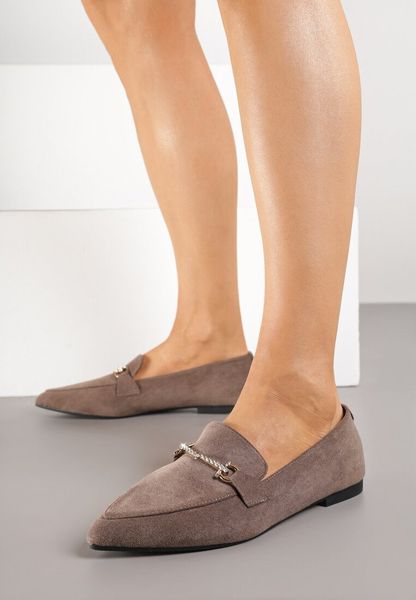 Ciemnobeżowe Mokasyny Vices z Noskiem w Szpic i Metaliczną Aplikacją Rilemise