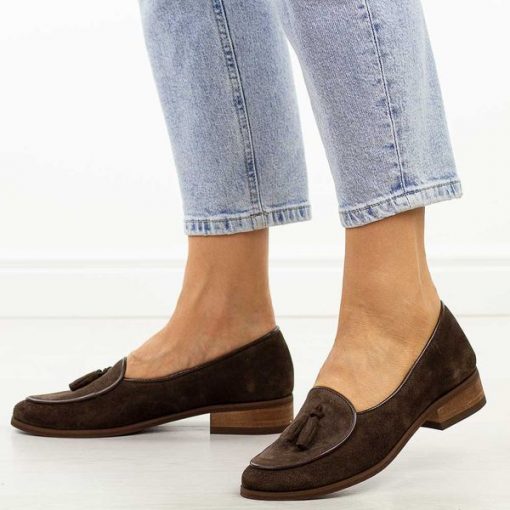 Czekoladowe skórzane zamszowe mokasyny damskieto eleganckie i wygodne obuwie, idealne na wiosnę, jesień oraz na wyjścia formalne. Wykonane z najwyższej jakości skóry naturalnej zamszowej, zachwycają miękkością w dotyku i wyjątkowym wyglądem. Wsuwana konstrukcja zapewnia łatwość zakładania, a cholewka ozdobiona modnymi frędzlami dodaje im charakteru i lekkości. Wkładka z naturalnej skóry gwarantuje wysoki komfort noszenia, a płaski […]