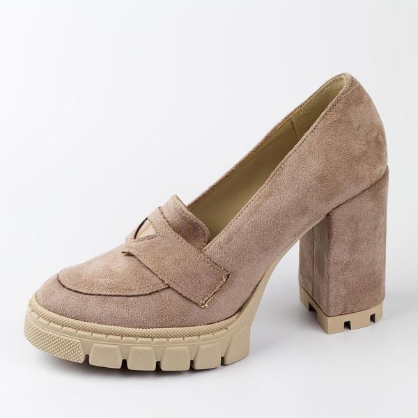 Beżowe zamszowe Polskie mokasyny damskie na słupku, loafersy Deoni D213