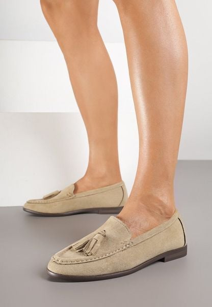 Ciemnobeżowe Mokasyny z Imitacji Zamszu Zdobione Frędzlami Naloretia