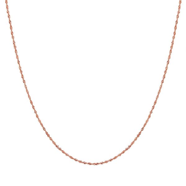 INFORMACJE OGÓLNE: Rodzaj łańcuszka: Łańcuszek singapurski Zapięcie: Zapięcie na karabińczyk Grupa docelowa: Kobiety Kolekcja: Artykuły codziennego użytku MATERIAŁ: Materiał podstawowy: Srebro wysokiej próby Kolor materiału podstawowego: Różowy złoty Delikatność: 925/- Powłoka: pozł. różowym złote Wykończenie powierzchni: Polerowana na wysoki połysk WYMIARY: Szerokość łańcuszka w mm, w przybliżeniu: 1,2
