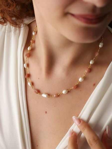 – materiał: mosiądz- powłoka: złoto- zapięcie: karabińczyk- rodzaj kamienia: słoneczny- kolor kamienia: jasnoróżowy- rodzaj perły: hodowlana – słodkowodna- kolor pereł: biały- regulacja długości: takWskazówka: Zdjęcie produktu w powiększeniu.