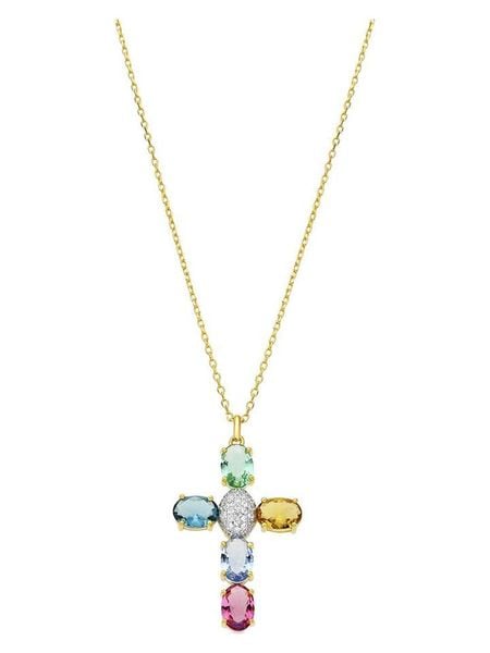 – materiał: srebro Sterling próby 925- powłoka: w kolorze złota- typ łańcuszka: ankier- zapięcie: federing- rodzaj kamienia: cyrkonia- kolor kamienia: wielokolorowy- kształt zawieszki: krzyż- regulacja długości: takWskazówka: Zdjęcie produktu w powiększeniu.
