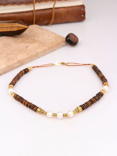 – materiał 1: stal szlachetna- materiał 2: tkanina- powłoka: złoto- zapięcie: karabińczyk- rodzaj kamienia: tygrysie oko- kolor kamienia: jasnobrązowy- rodzaj perły: hodowlana – słodkowodna- kolor pereł: biały- regulacja długości: takWskazówka: Zdjęcie produktu w powiększeniu.