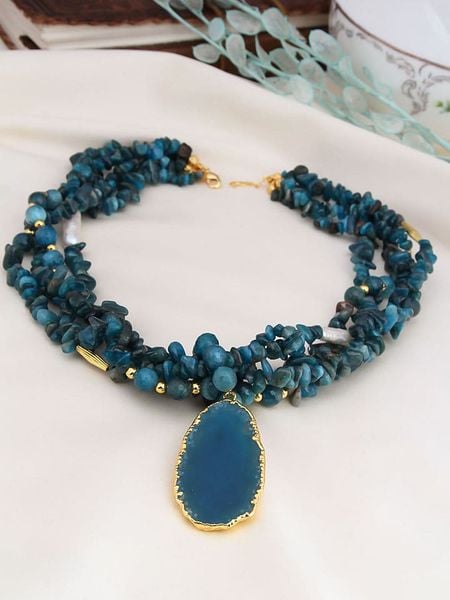 – materiał: mosiądz- powłoka: złoto- zapięcie: karabińczyk- rodzaj kamienia: apatyt- kolor kamienia: niebieski- regulacja długości: takWskazówka: Zdjęcie produktu w powiększeniu.
