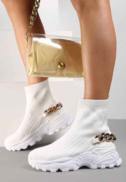 Sneakersy Philopis na grubej i lekko nieregularnej podeszwie ze żłobieniami. Pod spodem szeroki bieżnik. Wsuwane, z noskiem o zaokrąglonej krawędzi. Cholewka wysoka, kończąca się przed kostką. Wykonane z elastycznego materiału tekstylnego, dekorowane delikatnym fakturowaniem. W środku wkładka z miękkiej pianki. Z tyłu ozdobny łańcuch. Sneakersy Philopis łączą w sobie najważniejsze trendy sezonu.