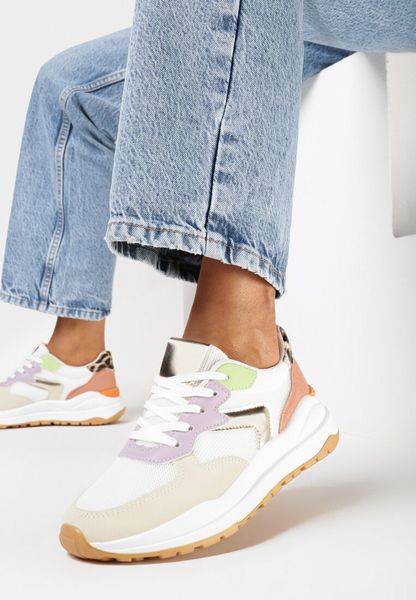 Biało-Żółte Sneakersy na Płaskiej Podeszwie z Ozdobnymi Wstawkami Laraet