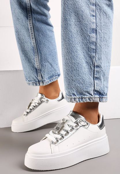 Biało-Srebrne Sneakersy z Metaliczną Ozdobą z Cyrkoniami przy Sznurówkach Awenttes