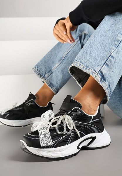 Czarne Sneakersy z Koralikami Kokardą i Geometrycznym Wzorem Sarivela