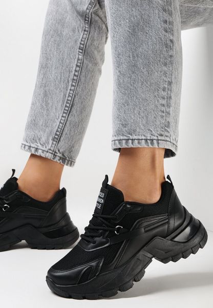 Czarne Sneakersy na Grubej Podeszwie z Ozdobnym Sznurowaniem przed Kostkę Mystarie