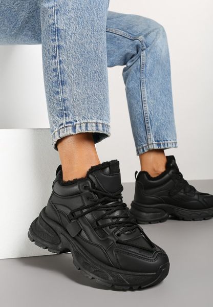 Czarne Sneakersy na Grubej Podeszwie z Futrzaną Wyściółką Miada