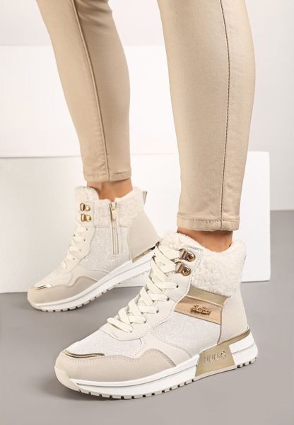 Beżowe Sneakersy z Futrem Metaliczną Wstawką i Brokatowym Połyskiem Saliwenna