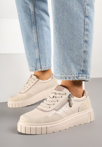 Beżowe Sneakersy z Naturalnej Skóry na Grubej Podeszwie z Suwakiem Soravelle