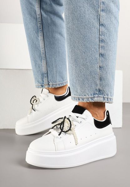 Biało-Czarne Sneakersy na Platformie z Perełkami Przy Sznurowadłach Ulianori