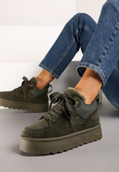 Ciemnozielone Sneakersy na Grubej Podeszwie Ocieplane Futerkiem Tifitana
