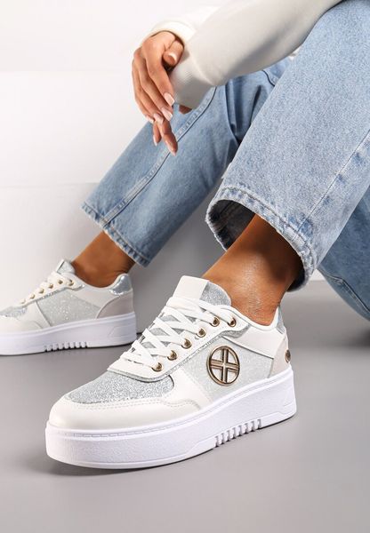 Białe Sneakersy na Grubej Podeszwie z Brokatem i Metaliczną Wstawką Velari