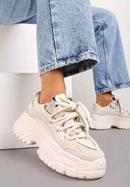 Beżowe Sznurowane Sneakersy na Grubej Tłoczonej Podeszwie z Aplikacją Tilinae