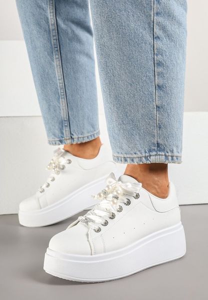Białe Sneakersy na Platformie Ozdobione Cyrkoniami i Perforacją Nurilita