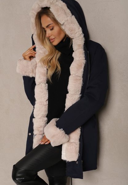 Granatowa Kurtka Typu Parka z Kapturem i Futerkiem z Możliwością Odpięcia Marindria