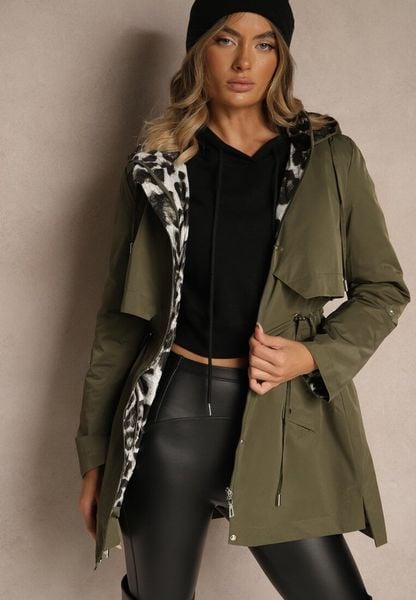 Zielono-Beżowa Kurtka Parka z Futerkowym Odpinanym Zdobieniem przy Kapturze Inellae