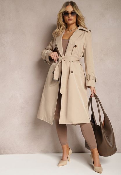 Beżowy Płaszcz Trencz Dwurzędowy z Plisami z Tyłu i Materiałowym Paskiem Hellie