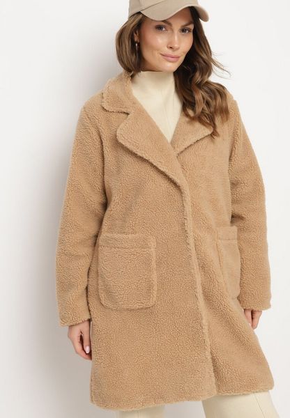 Beźowy Futrzany Płaszcz Ozdobiony Kieszeniami Mortisa