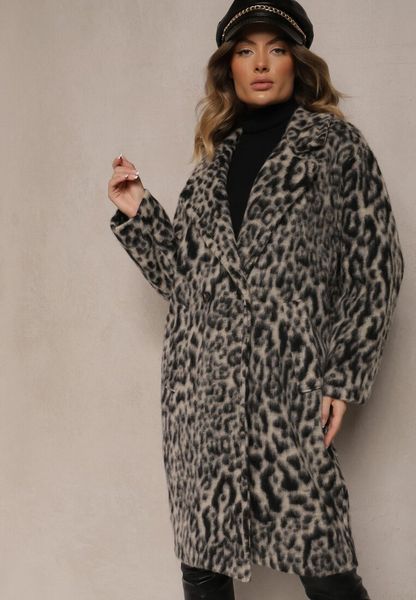 Szary Panterkowy Płaszcz Dwurzędowy Pesaltia