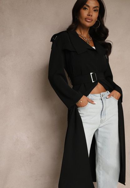 Czarny Płaszcz Jednorzędowy Trencz z Paskiem w Talii Mavinisse