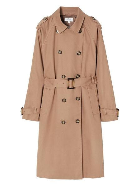 Jasnobrązowy Płaszcz o Wydłużonym Fasonie Trencza z Guzikami i Paskiem Dennime